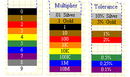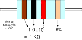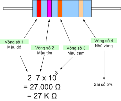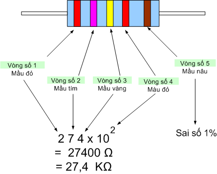Điện trở thường được ký hiệu bằng 4 vòng mầu , điện trở chính xác thì ký hiệu bằng 5 vòng mầu.