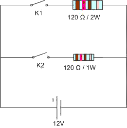 Ở sơ đồ trên cho ta thấy : Nguồn Vcc là 12V, các điện trở đều có trị số là 120Ω nhưng có công xuất khác nhau, khi các công tắc K1 và K2 đóng, các điện trở đều tiêu thụ một công xuất là