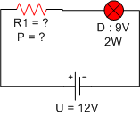 – Như hình trên ta có thể tính được trị số và công xuất của điện trở cho phù hợp như sau: Bóng đèn có điện áp 9V và công xuất 2W vậy dòng tiêu thụ là I = P / U = (2 / 9 ) = Ampe đó cũng chính là dòng điện đi qua điện trở.